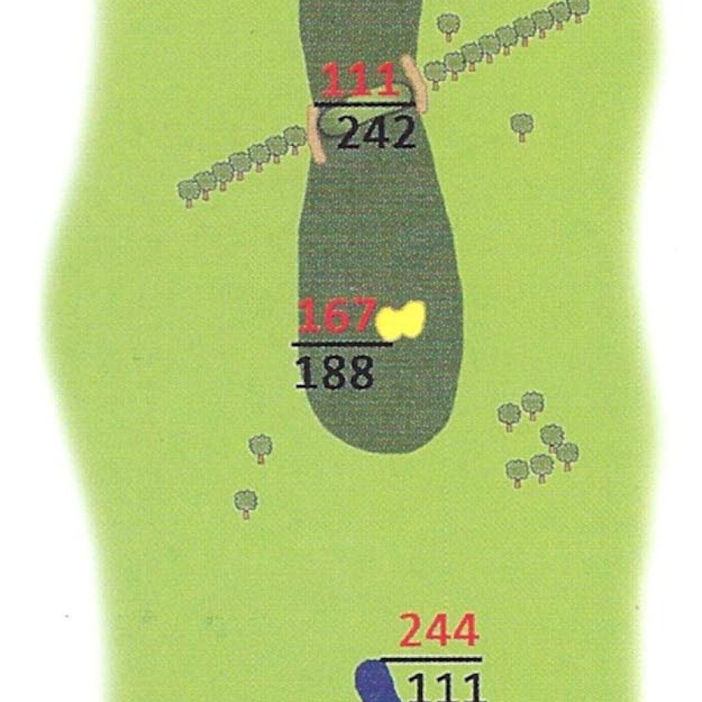 Either lay up, by taking an iron or fairway wood off the tee and guarantee a second shot to the green, or attempt to clear the ditch by hitting, what must be, a straight shot with a driver. The green should hold no dangers.